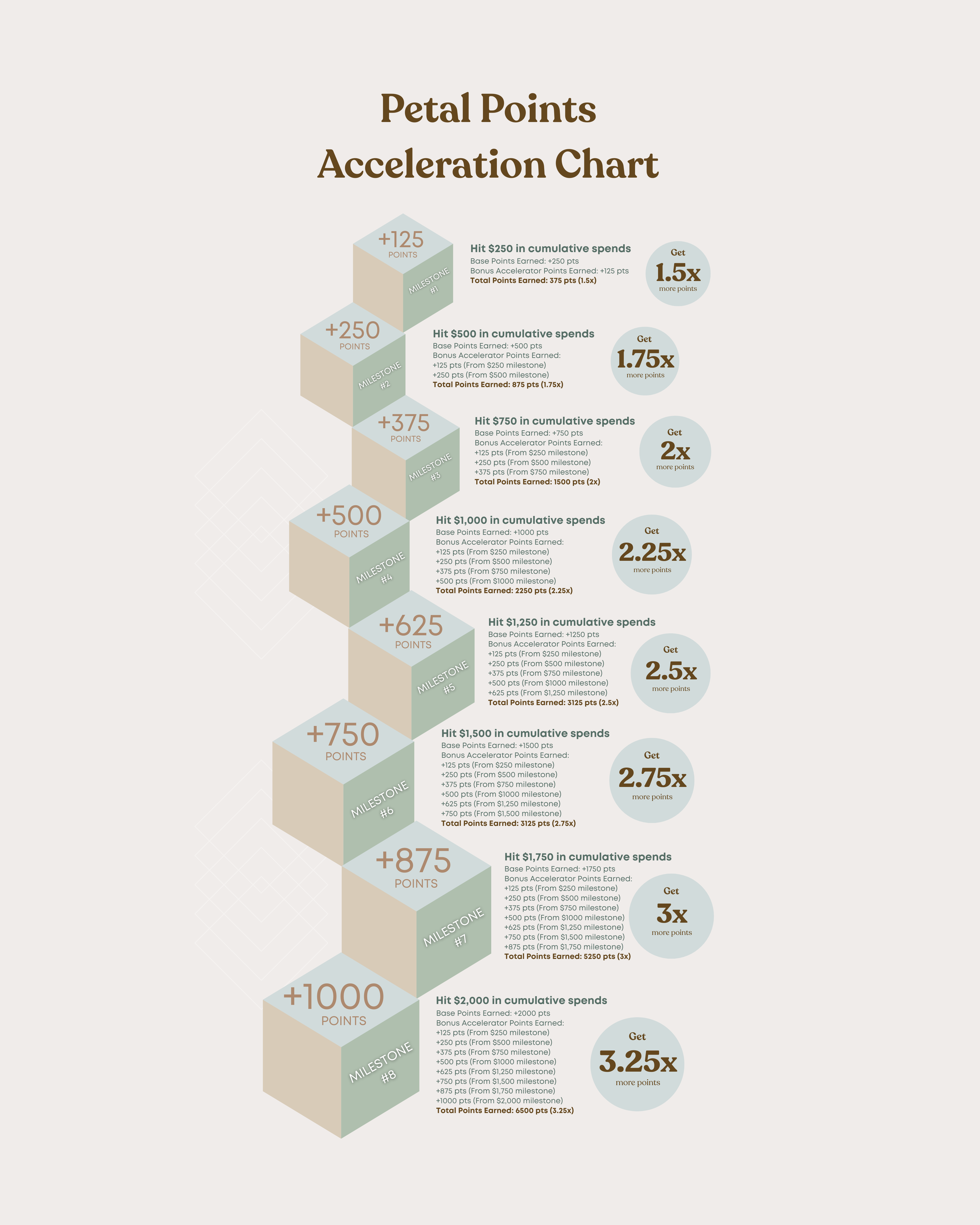 Our Petal Points booster is a points acceleration program that rewards you with bonus petal points every time you reach a spending tier.