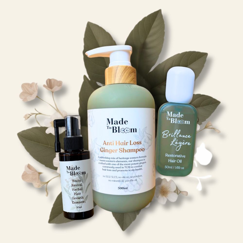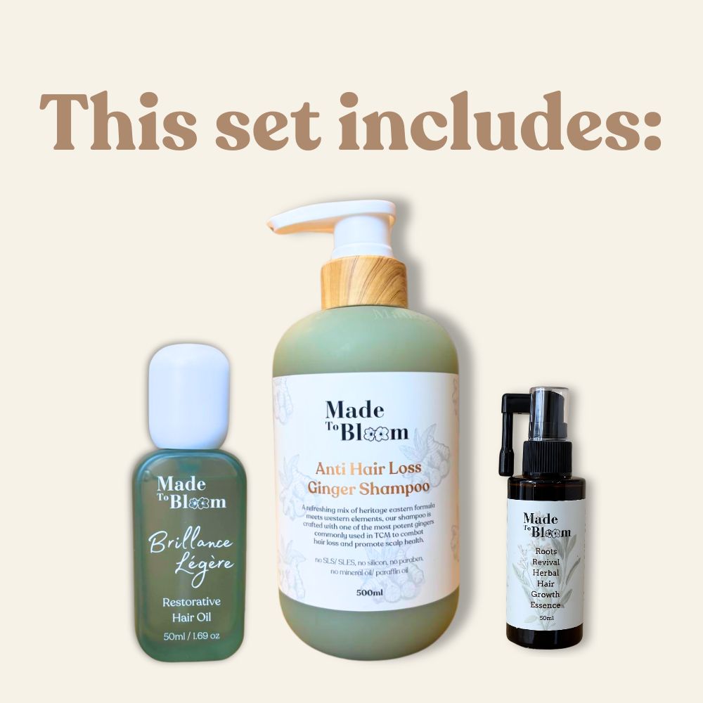 A powerful 3-step routine designed to reduce hair fall, strengthen roots, and restore scalp balance. This curated set blends traditional herbal wisdom with clean, modern formulas to support healthier, fuller-looking hair — naturally.