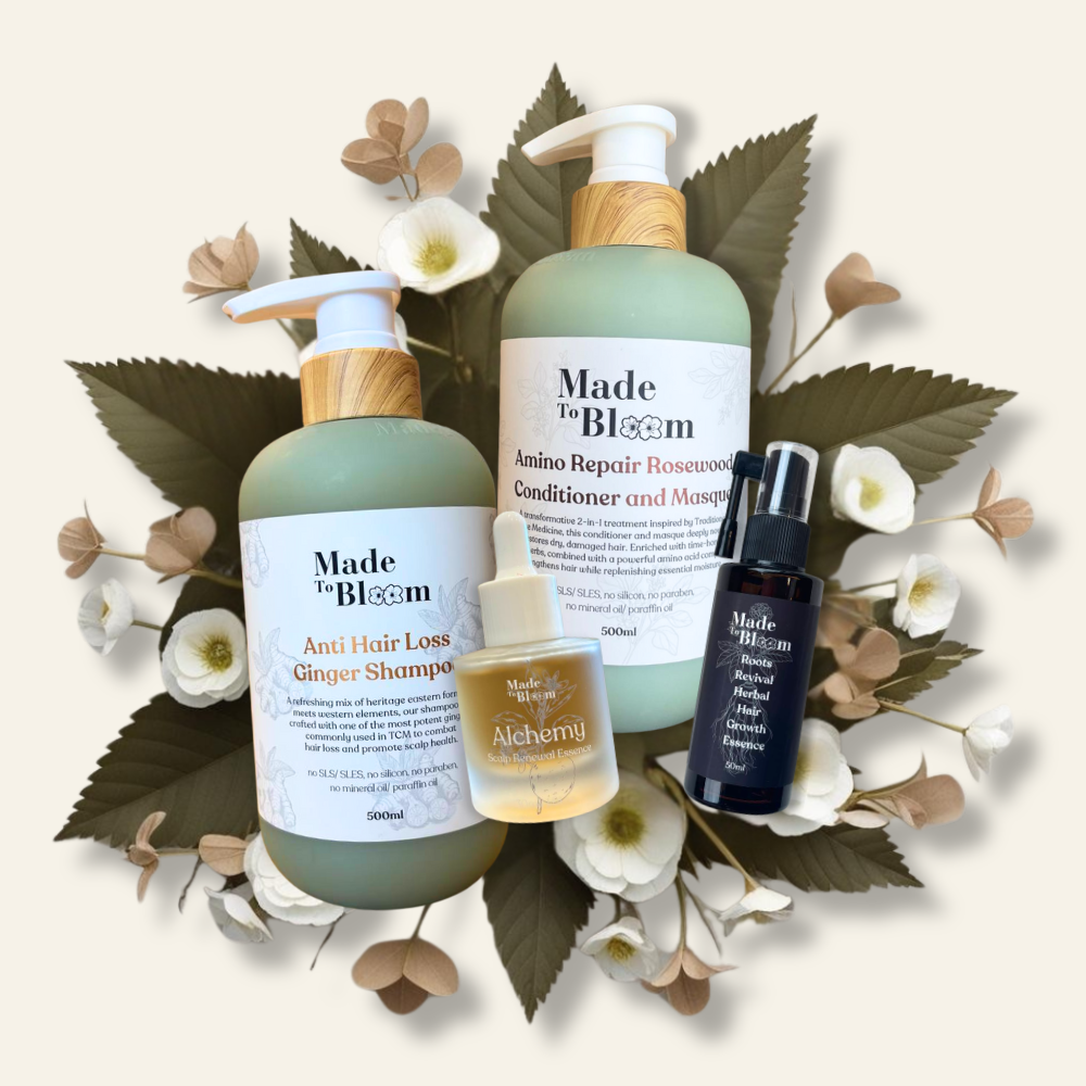 Give your hair the care it deserves with MadeToBloom’s premium trio: Anti Hair Loss Ginger Shampoo, Amino Repair Rosewood Conditioner & Masque, and our Alchemy Age Defying Essence.