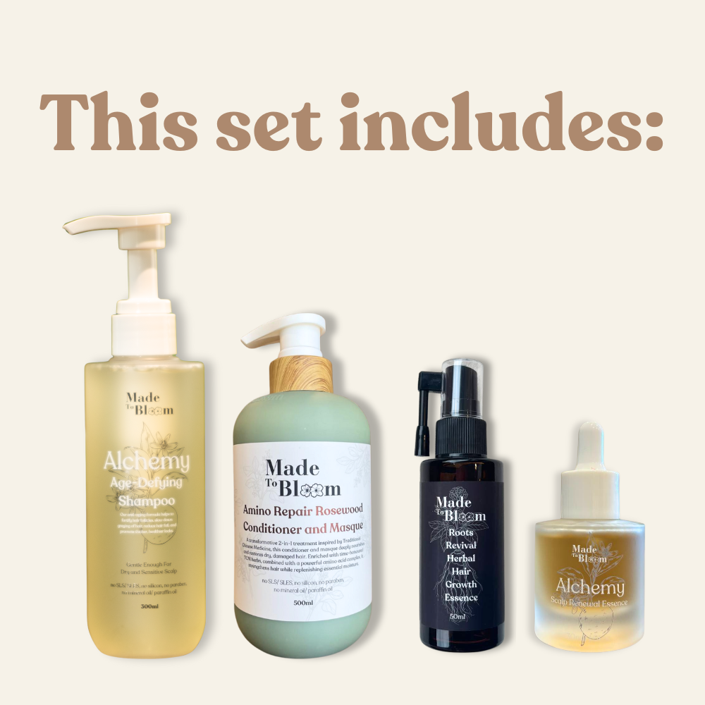 Alchemy Shampoo gently cleanses away buildup and excess oil without stripping essential moisture, making it ideal for dry and sensitive scalps. It helps maintain scalp elasticity and comfort, creating a balanced foundation so your roots can better absorb the benefits of the essences that follow.