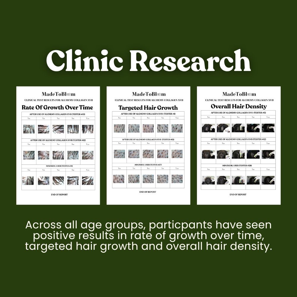 Our Alchemy series contains Collagen XVII — known as the key anti-aging collagen for follicle strength and dermal support. Helps restore scalp elasticity and anchor hair follicles more securely. Promotes thicker strands and the potential for multi-strand growth from a single follicle. Supports healthy melanin production to slow down and prevent greying. Whether you’re already using Roots Revival or just starting your hair recovery journey, Alchemy is the essential anti-aging boost that strengthens your scalp foundation — so your hair grows fuller, healthier and stays with you longer.